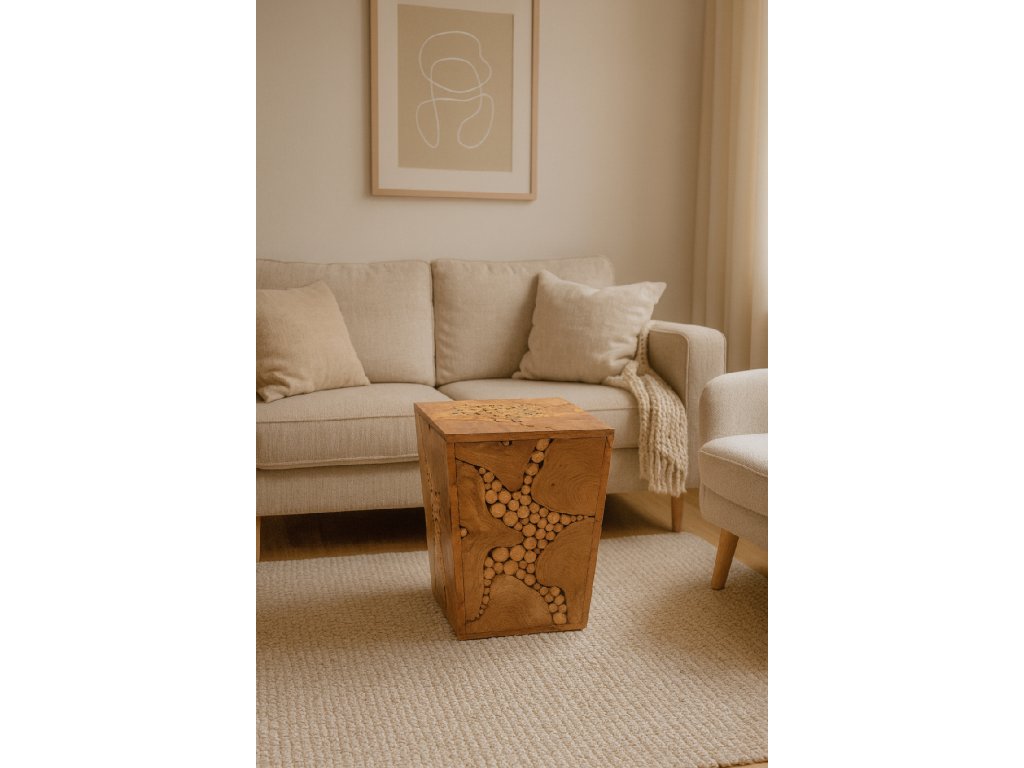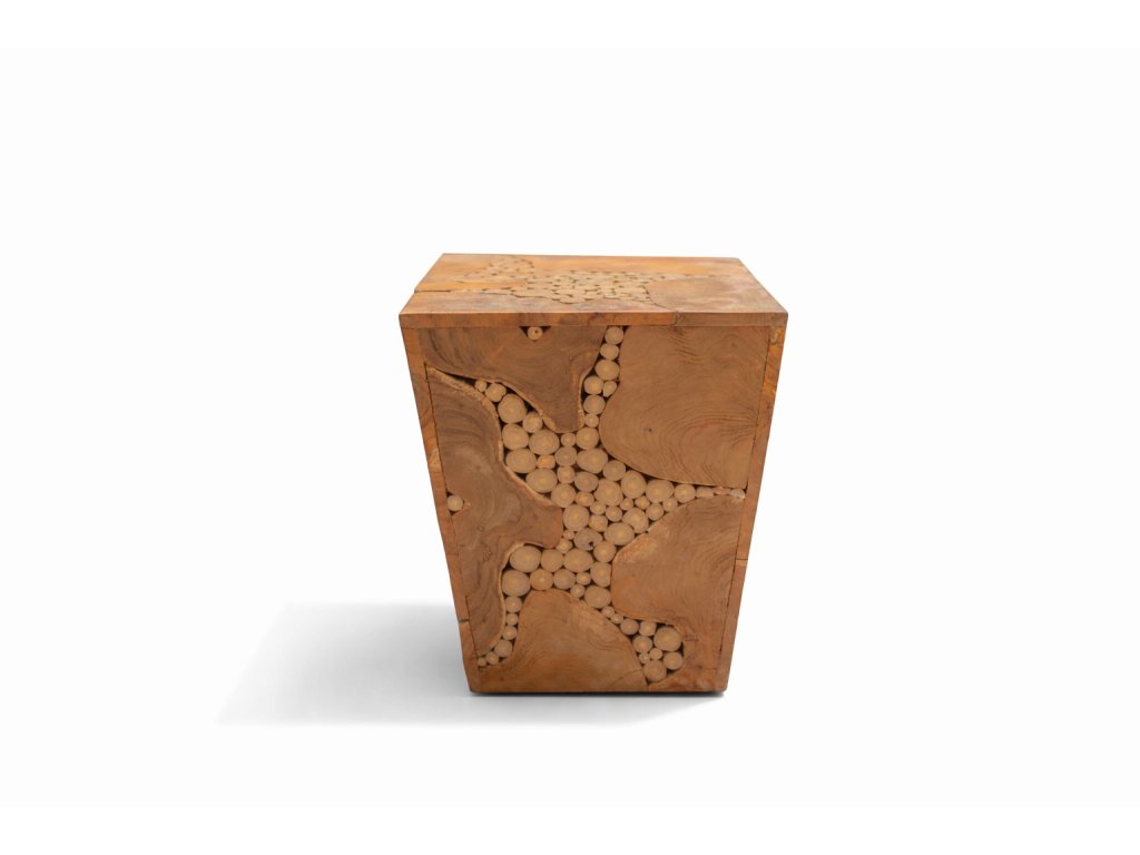 Vneste do svého interiéru jedinečný přírodní prvek, který zaujme na první pohled. Tento exkluzivní stolek ve tvaru kostky je vyroben z masivního teakového dřeva, jehož obvodové části tvoří krásně strukturované řezy s unikátní kresbou a organickými liniemi.