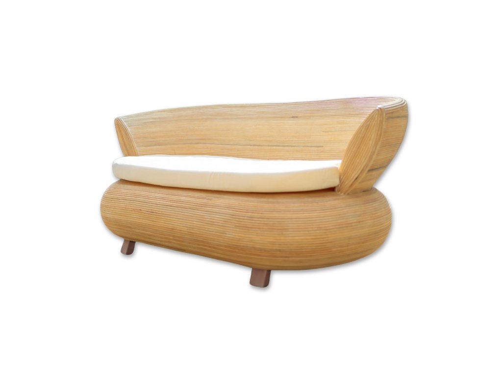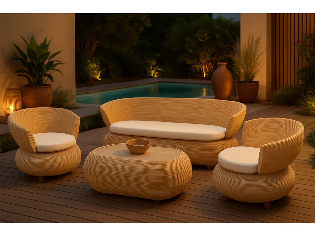 Každý kus je pečlivě tvarován do elegantních, zaoblených linií, které dodávají nábytku harmonický a příjemný vzhled. Přírodní odstín ratanu vytváří svěží a vzdušnou atmosféru vhodnou jak do interiéru, tak na kryté terasy či zimní zahrady. Sedačka i křesílka jsou vybaveny měkkými, krémově bílými polštáři, které zajišťují maximální pohodlí při posezení a zároveň podtrhují jemný a přírodní vzhled celého setu.