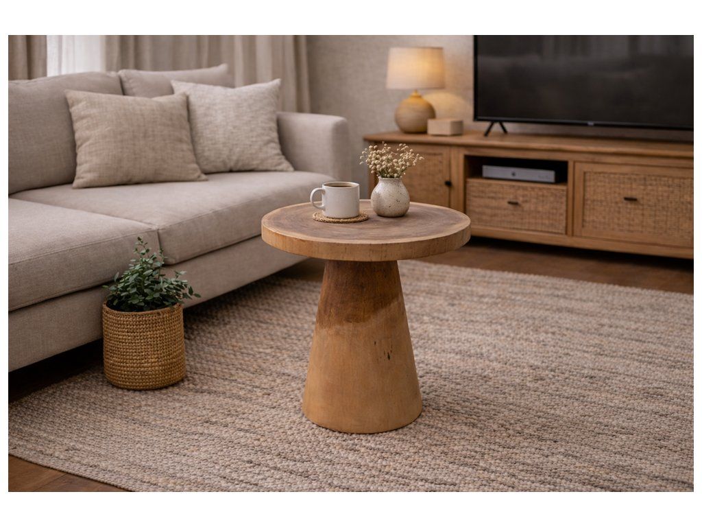 Teakový konferenční stolek s přírodním designem, který přináší do vašeho domova teplo a jedinečný charakter. Tento kulatý stolek je vyroben z masivního teakového dřeva, známého svou odolností a krásnou strukturou, jež vynikne v každém interiéru. Jednoduchý, ale pevný tvar podnože zajišťuje stabilitu a dlouhou životnost.