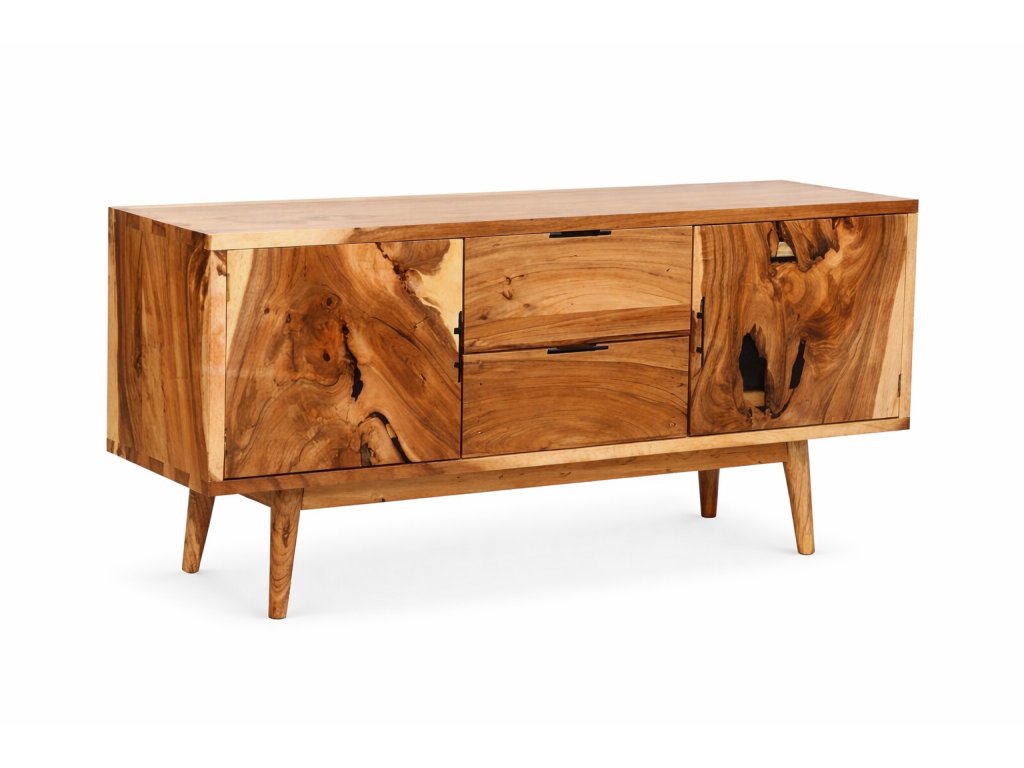 Dopřejte svému obývacímu pokoji nábytek, který v sobě spojuje sílu přírody a nadčasový design. Tento TV stolek je vyroben z masivního suarového dřeva, které je známé svou výraznou kresbou, hlubokými tóny a jedinečnou strukturou. Každý kus dřeva má vlastní charakter – přirozené suky, linie a barevné přechody vytváří originál, který nelze přesně zopakovat.