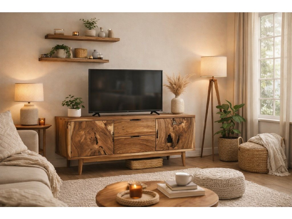 TV stolek ze suaru je ideální volbou pro interiéry, které chtějí propojit moderní styl s přírodními materiály. Díky své přirozené kráse se stane dominantním prvkem každého obývacího pokoje.