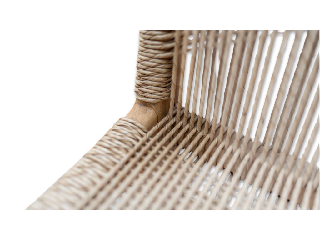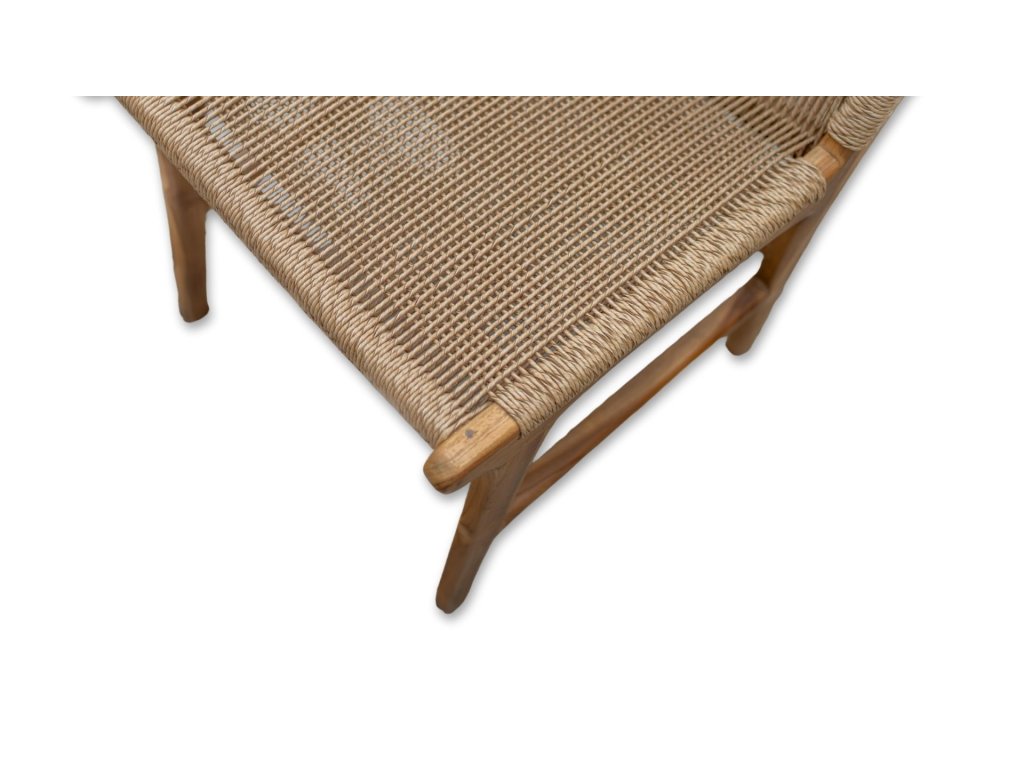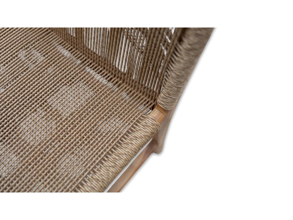 Sedák a opěradlo jsou ručně vyplétány pevným přírodním provazem, který zajišťuje pohodlí a zároveň dodává židli originální texturu a vzhled. Kombinace teakového dřeva a přírodního provazu vytváří nadčasový design, který zútulní každý prostor.