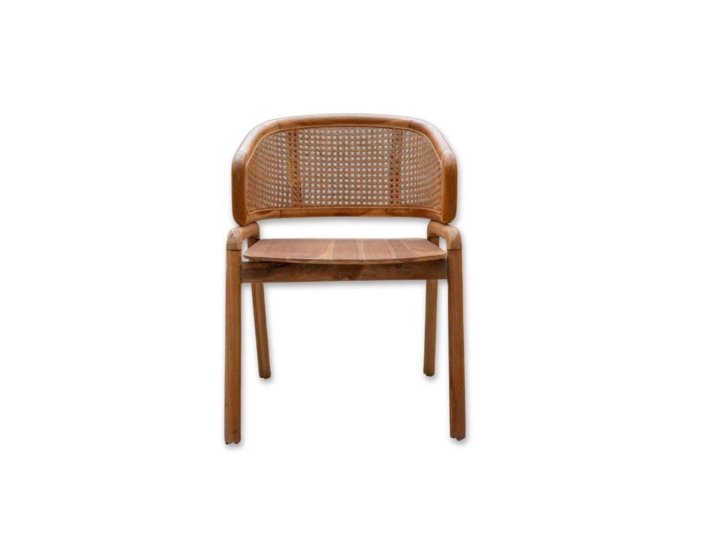 Tato židle je dokonalou kombinací přírodní krásy a precizního řemeslného zpracování. Vyrobena z masivního teakového dřeva, které je známé svou pevností a dlouhou životností, nabízí nejen pohodlné sezení, ale i odolnost vůči každodennímu používání. Opěradlo židle je zdobeno jemným výpletem, který přidává lehkost a vzdušnost celkovému designu.