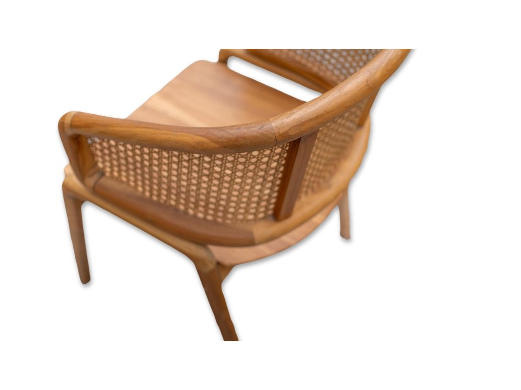 Tato židle je dokonalou kombinací přírodní krásy a precizního řemeslného zpracování. Vyrobena z masivního teakového dřeva, které je známé svou pevností a dlouhou životností, nabízí nejen pohodlné sezení, ale i odolnost vůči každodennímu používání. Opěradlo židle je zdobeno jemným výpletem, který přidává lehkost a vzdušnost celkovému designu.